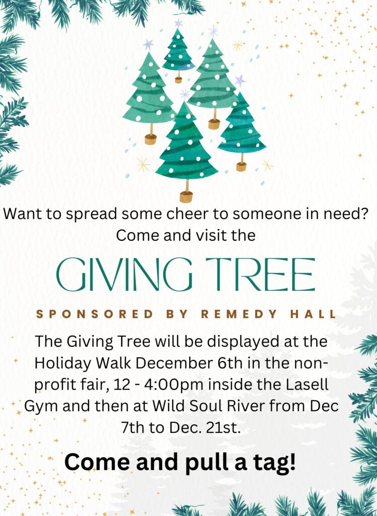 - From December 7th to December 21st, the Giving Tree will be at Wild Soul River, located at 248 Cole Ave in Williamstown.